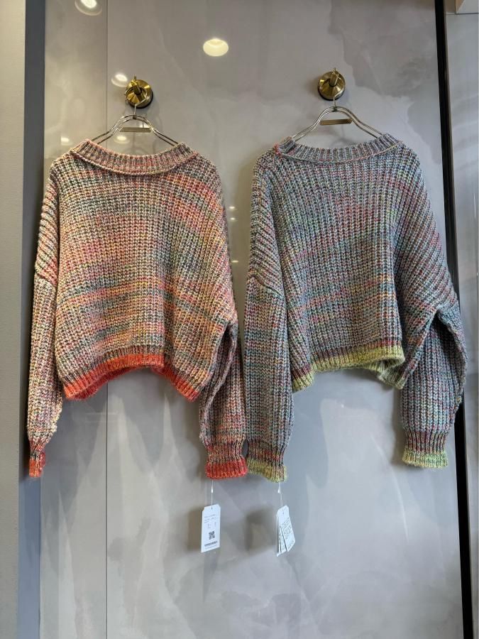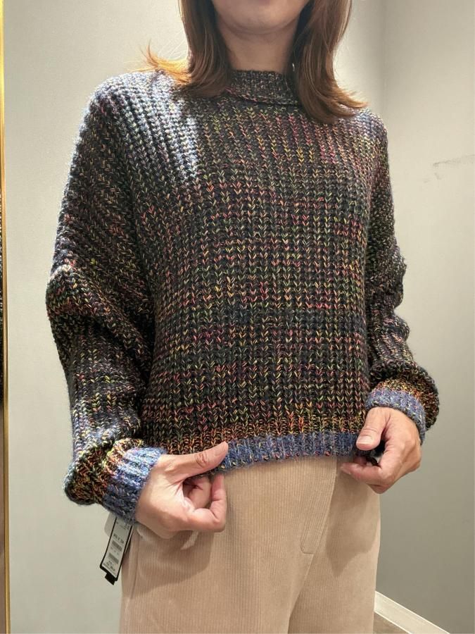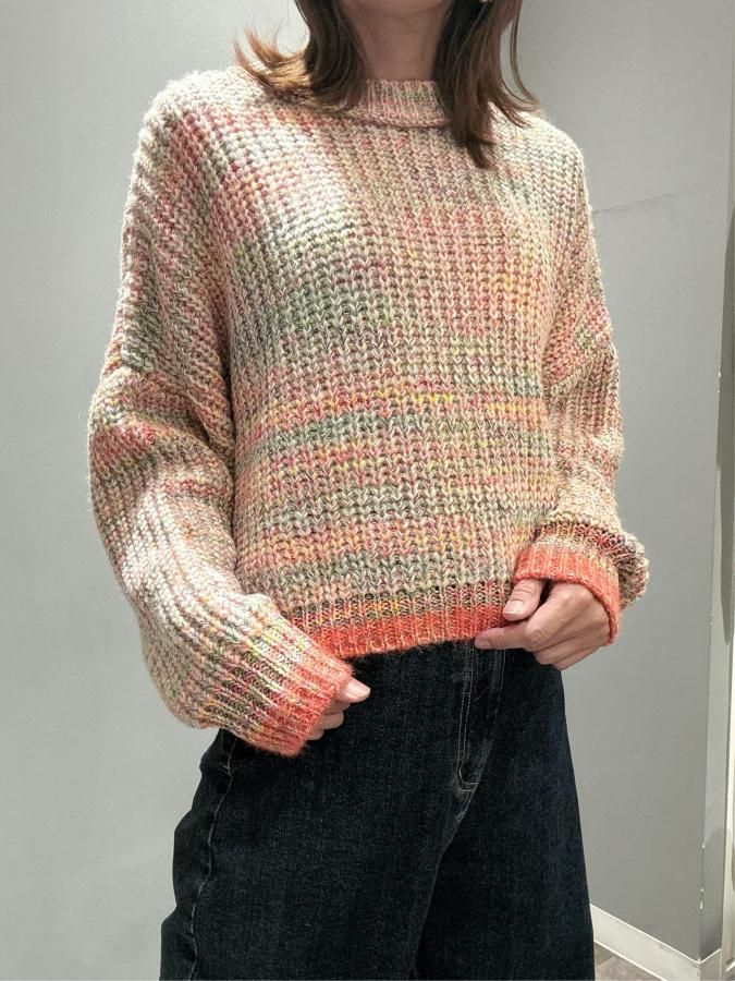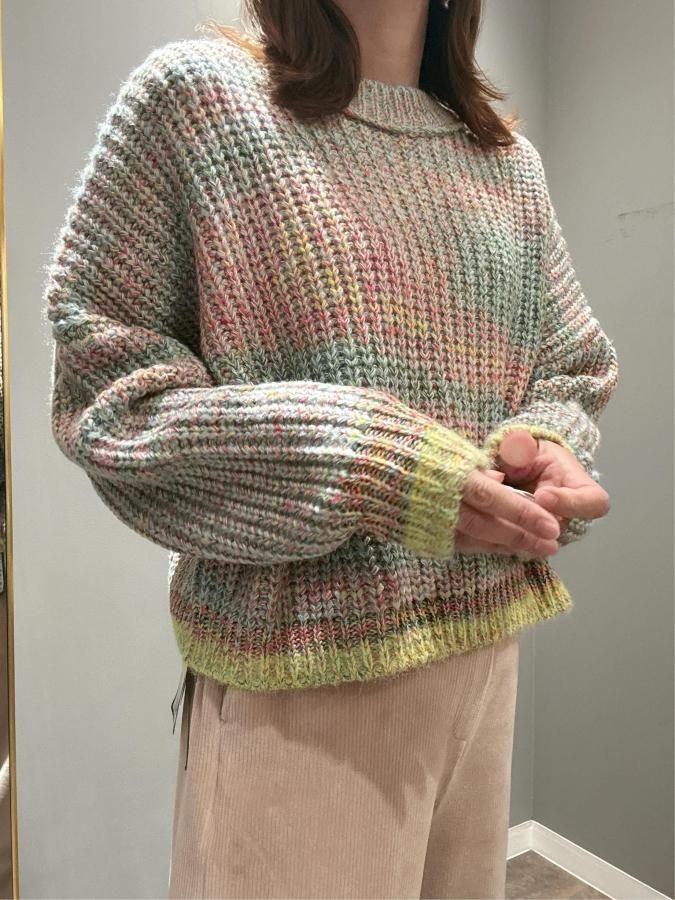 繊細な色使いが魅力的なこのニットは、まるで絵の具で描かれたような美しい色彩が目を奪います。