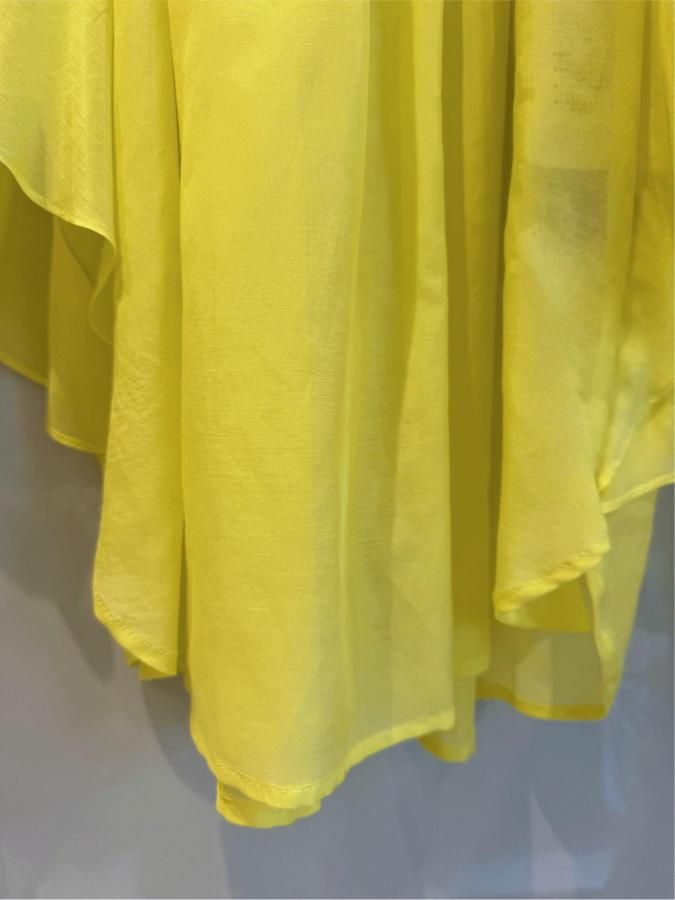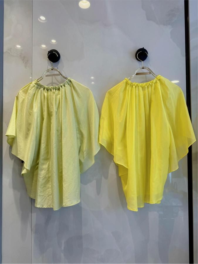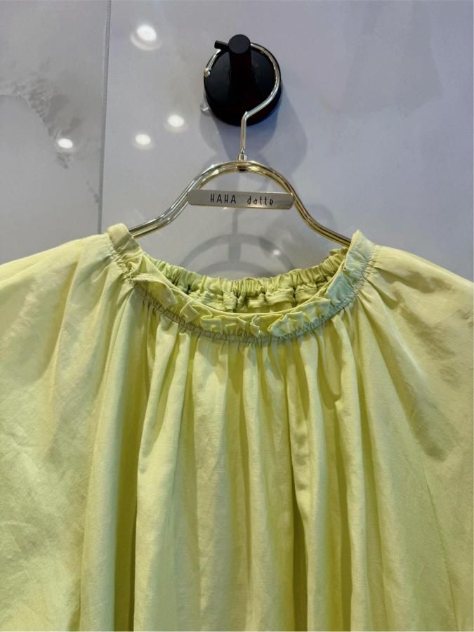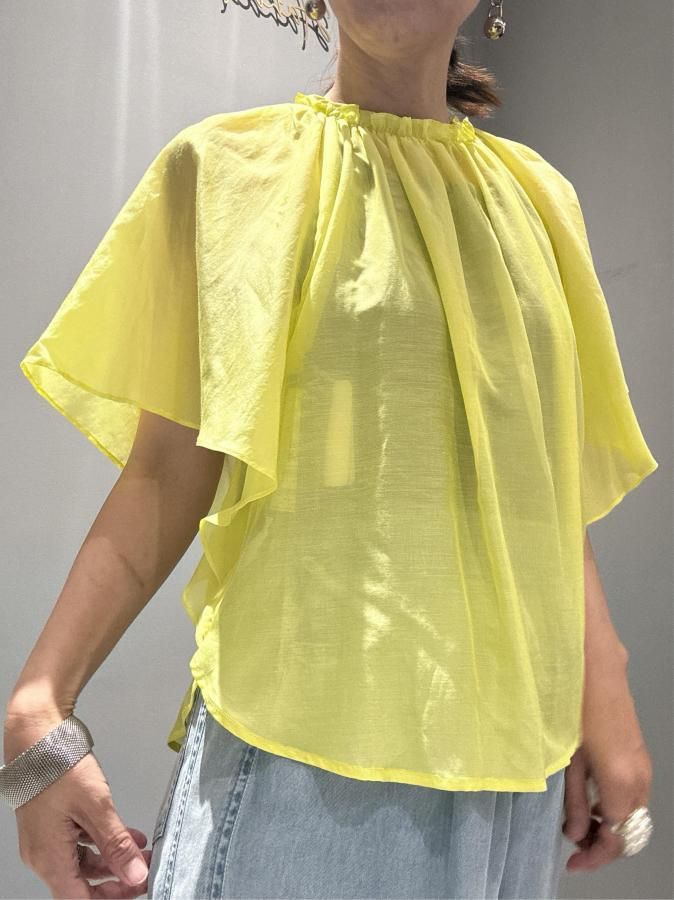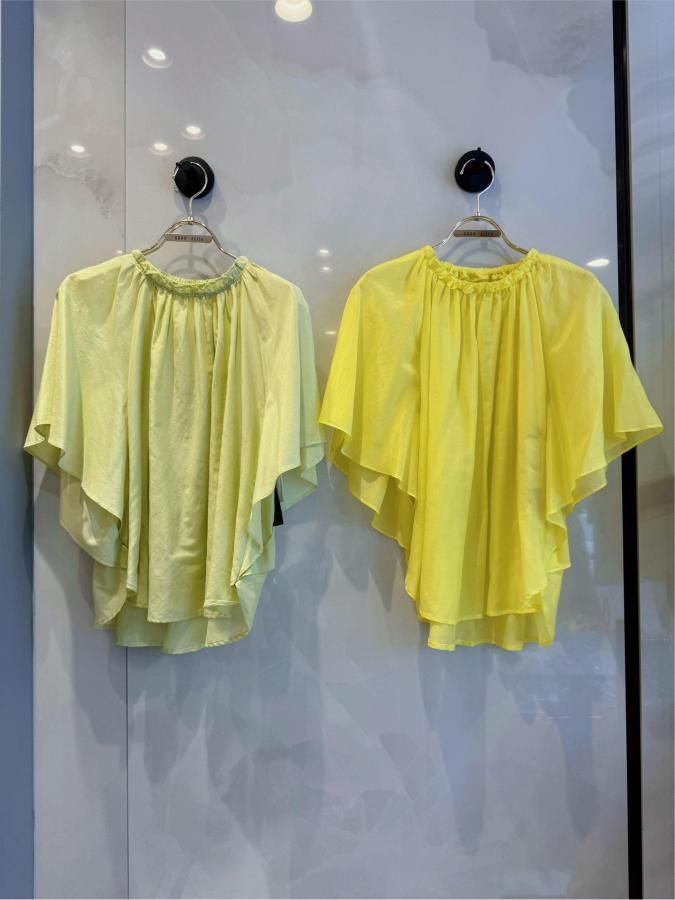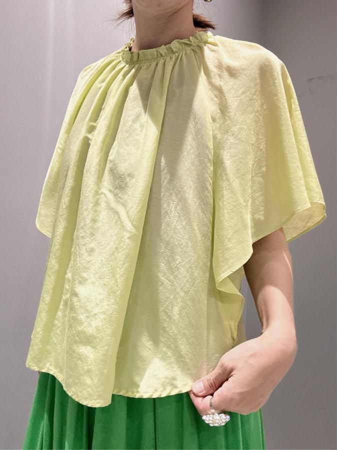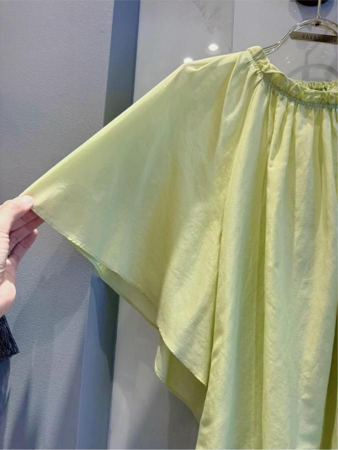 フリルカラーとフリンジが施されたデザインは、女性らしさを引き立てながらも遊び心をプラス。コットンとシルクを組み合わせた生地は、肌触りが良く、程よいツヤ感も魅力的です。