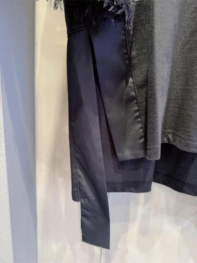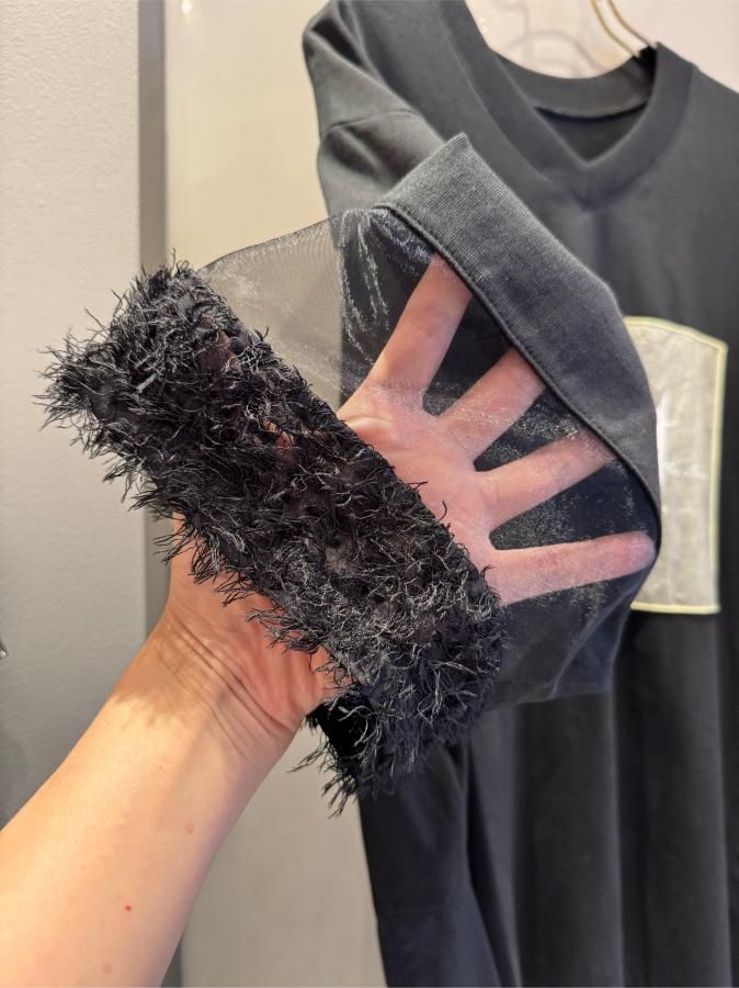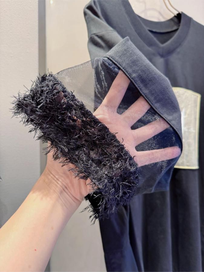 ビックシルエットのスタイリッシュなデザインが特徴で、アーム部分にはフリンジとシースルーのディテールが施されています。