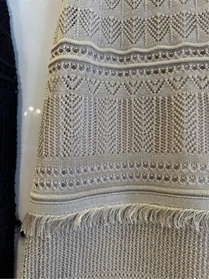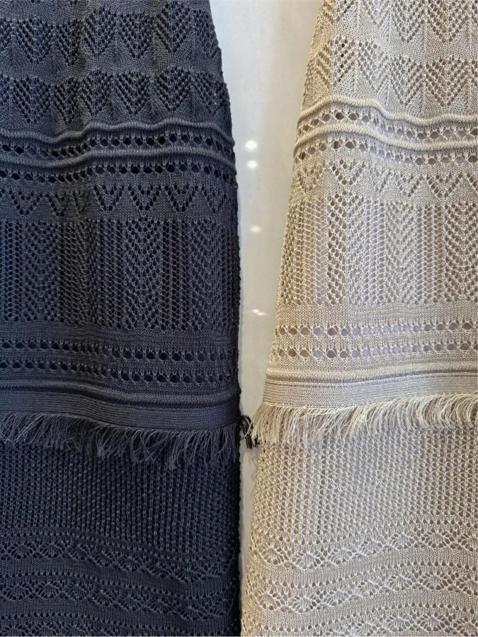 フリンジが施されたヘムラインが、動くたびにエレガントな揺れを演出し、周囲の視線を引きつけます。