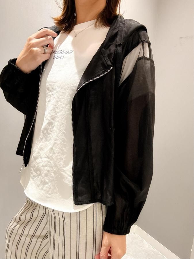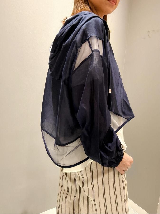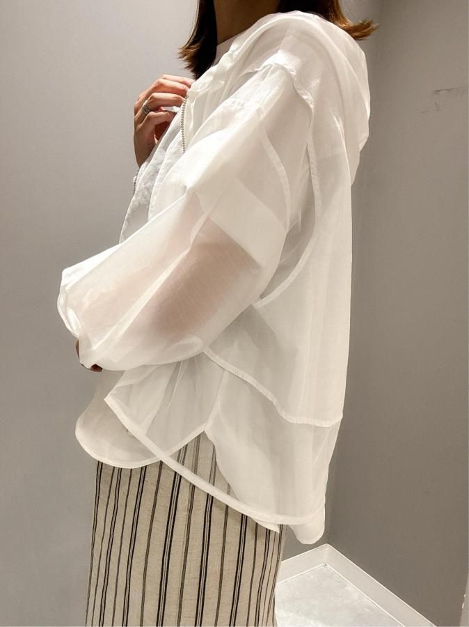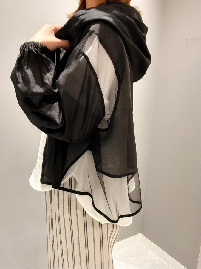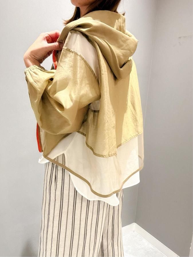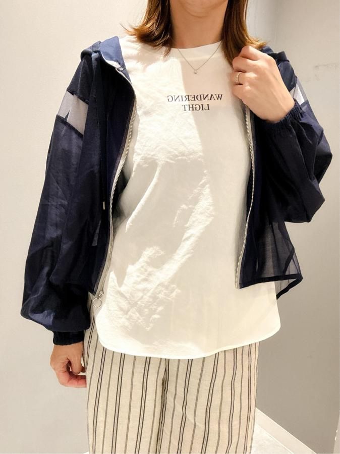 シアー切り替えが施されたこのパーカーは、他にはない上品な印象を与えます。