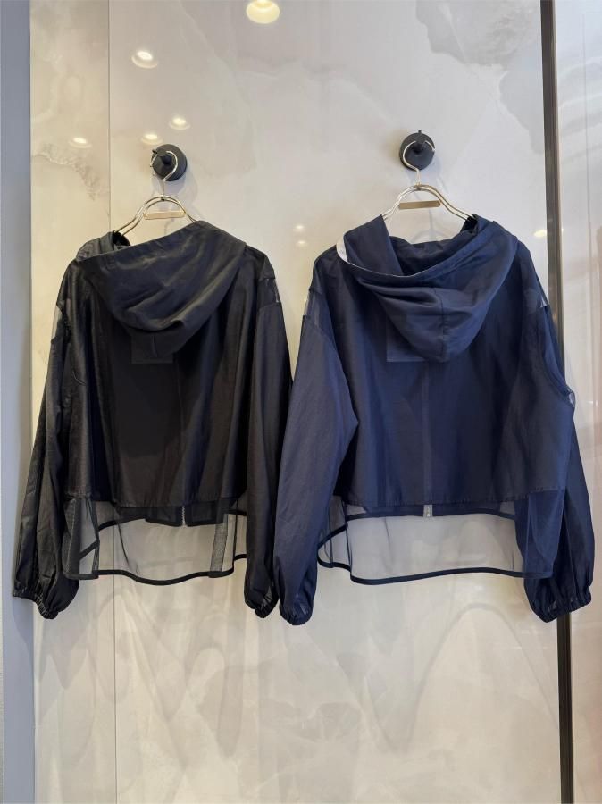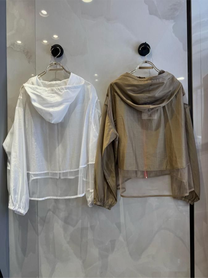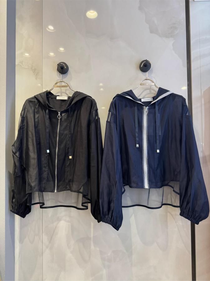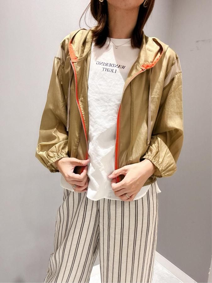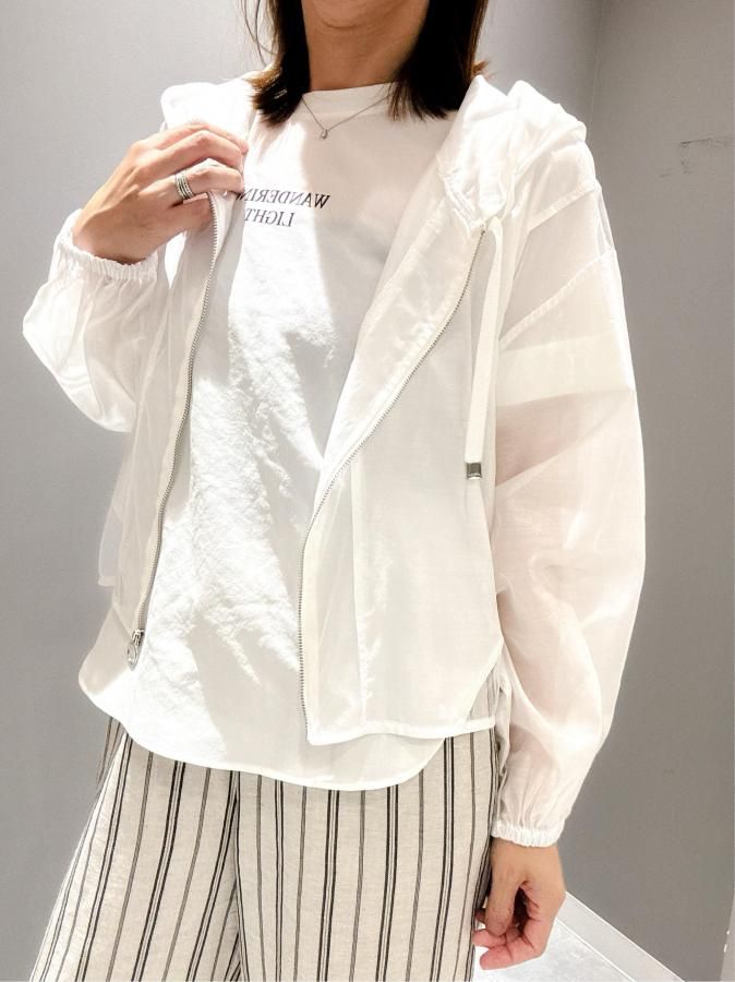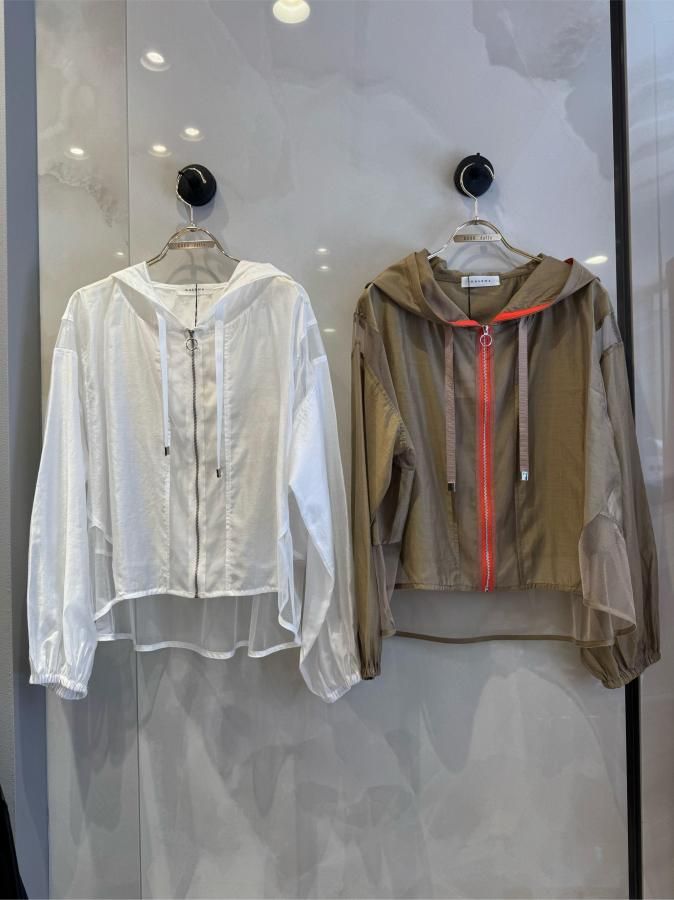 シアー切り替えが施されたこのパーカーは、他にはない上品な印象を与えます。