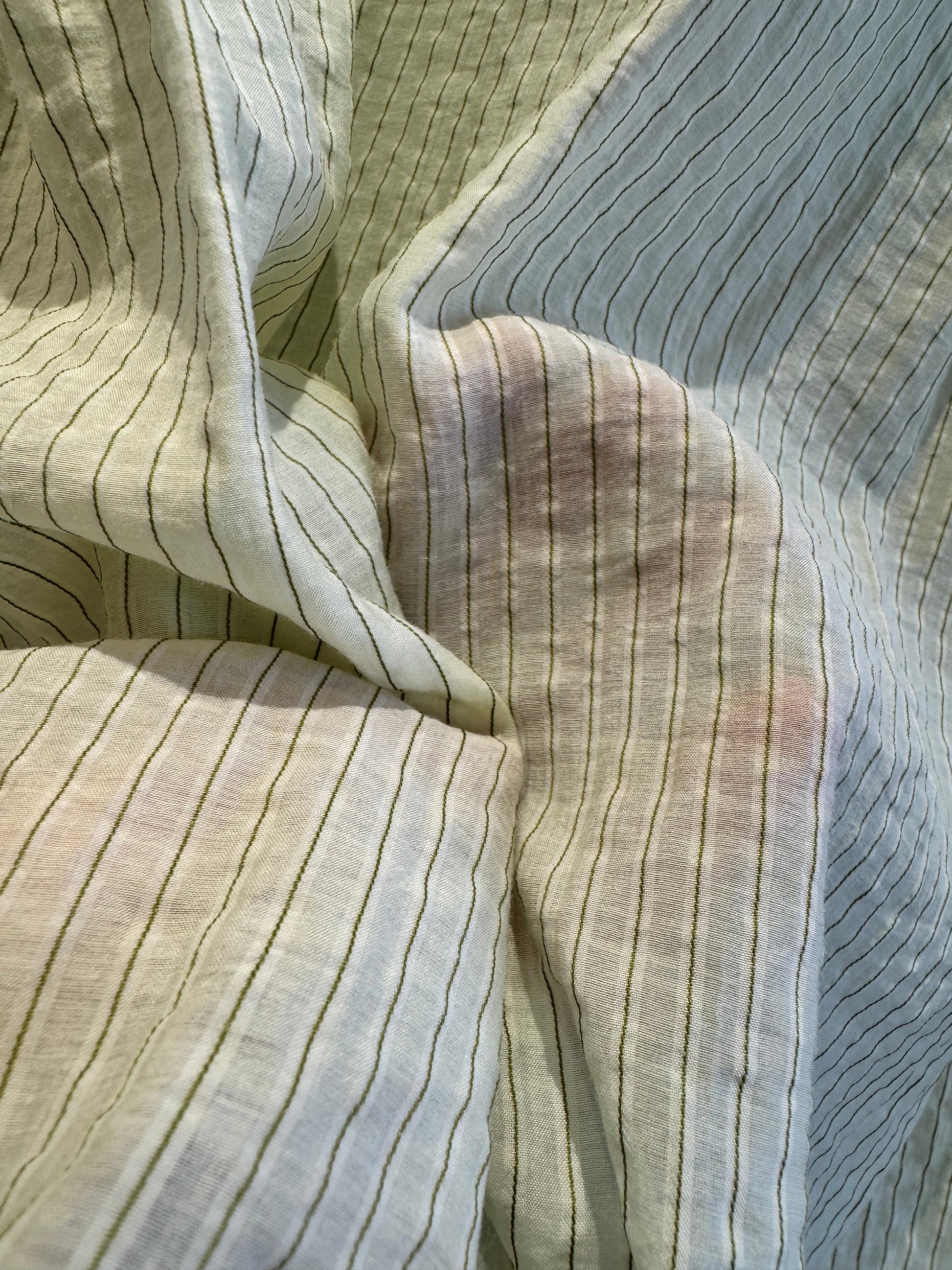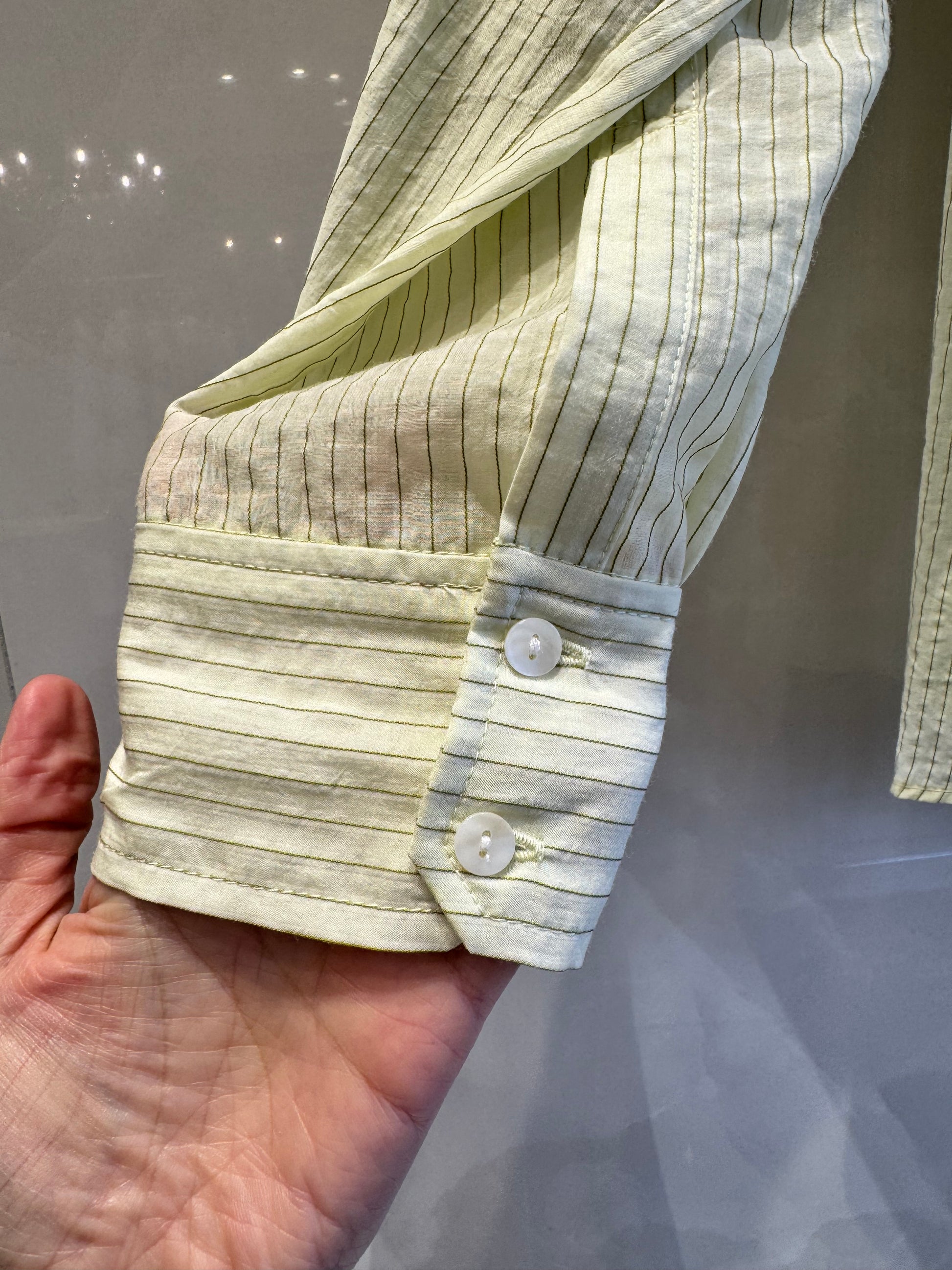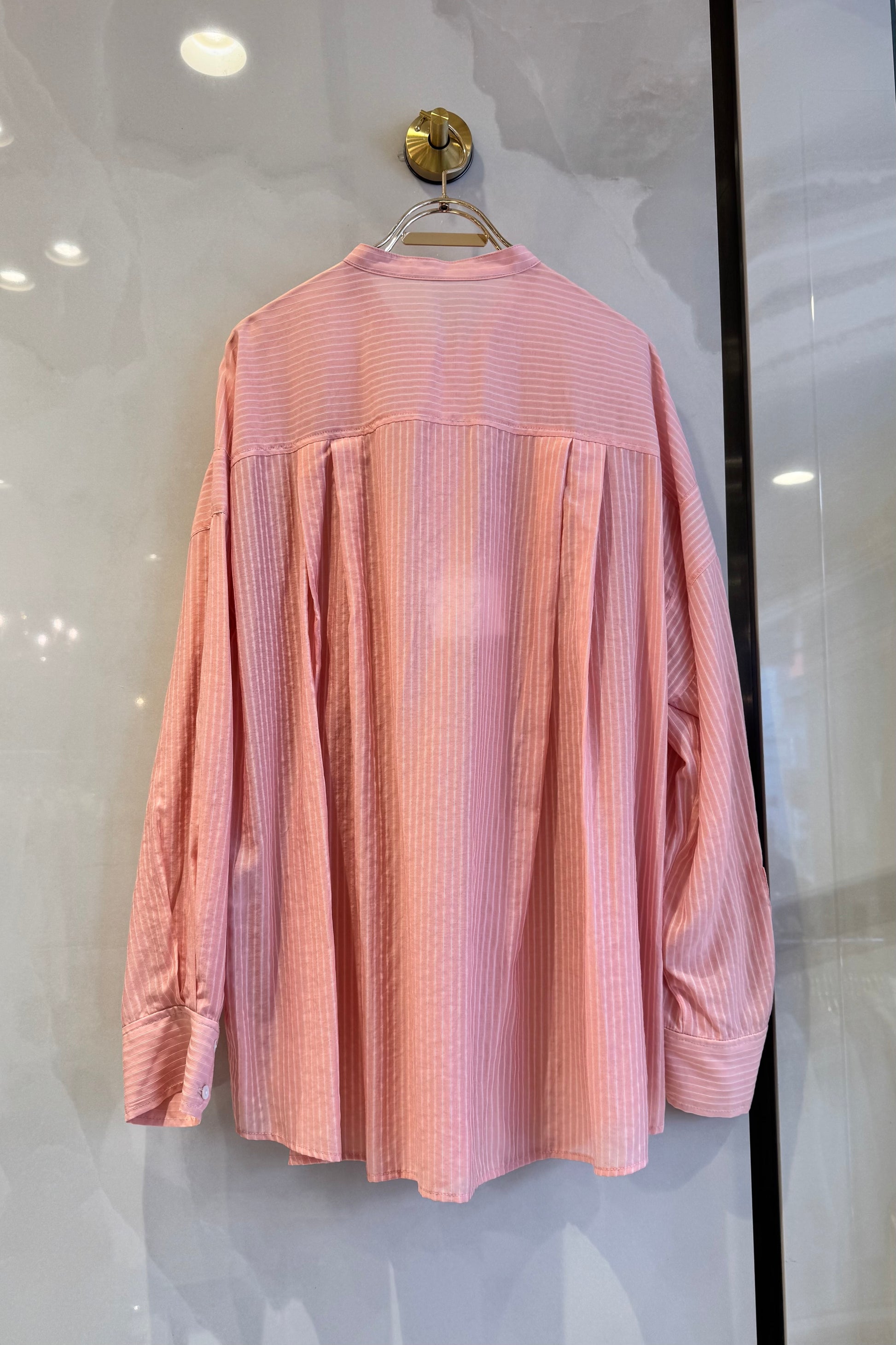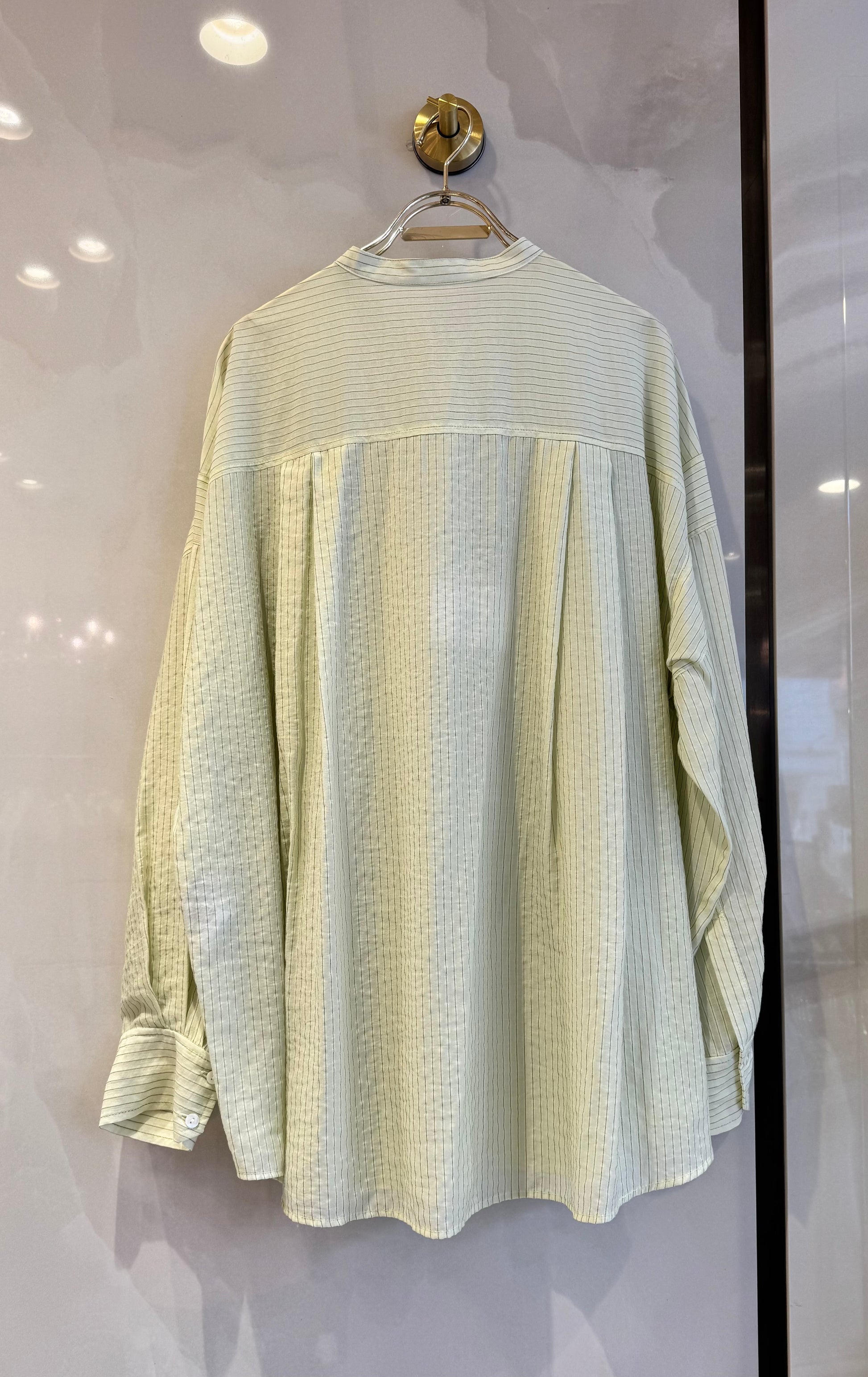 春色のストライプシャツは、透け感のあるデザインが特徴です。