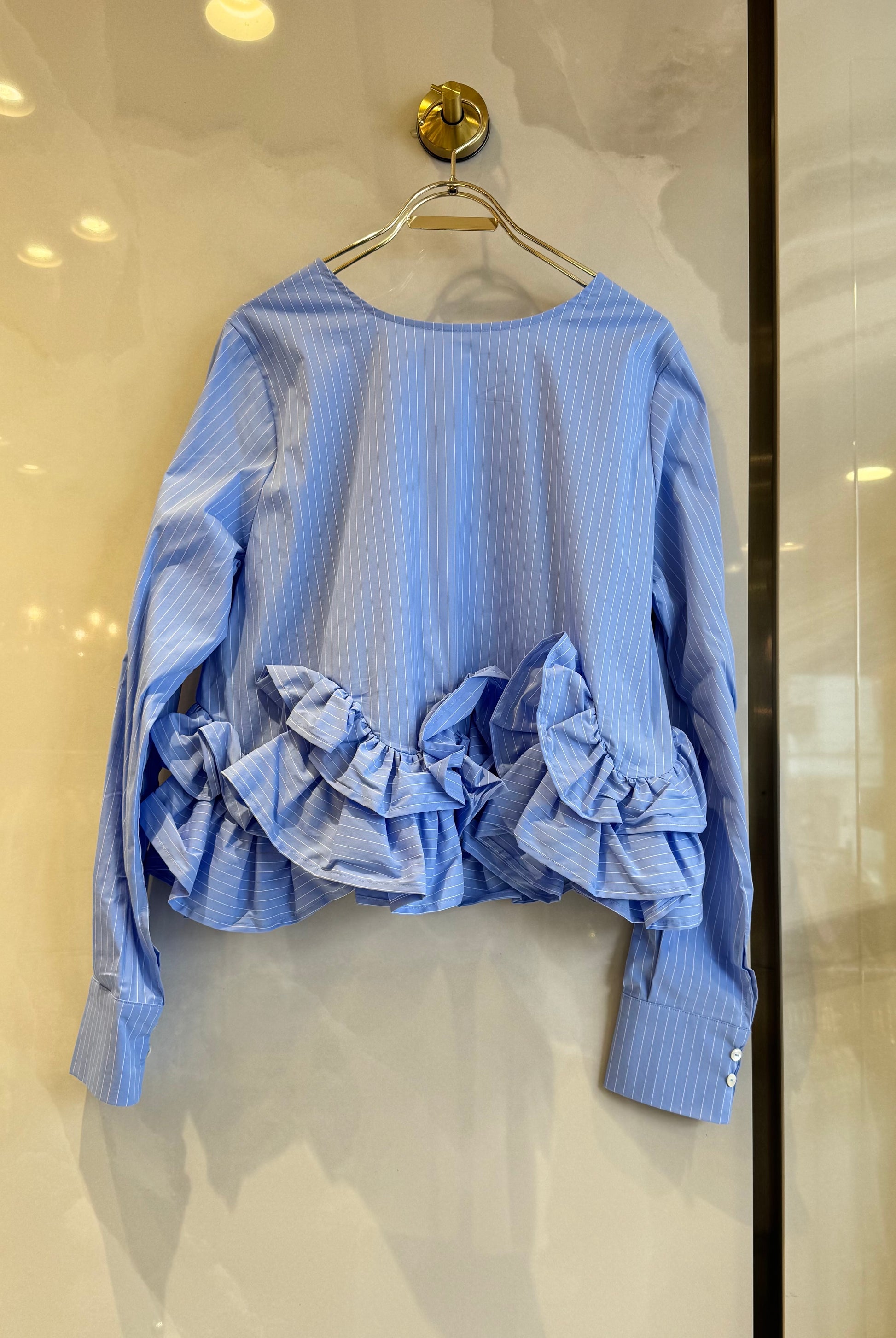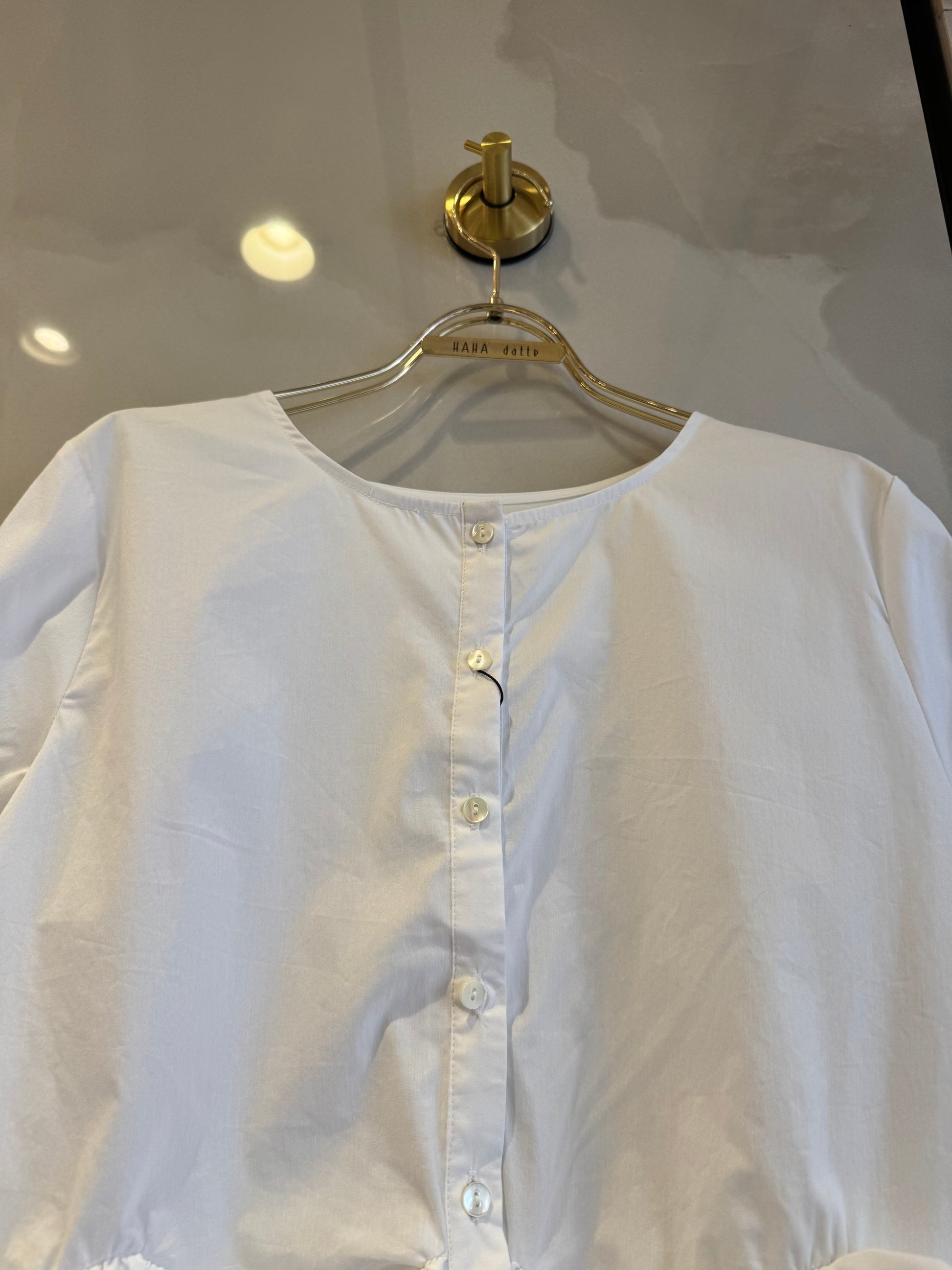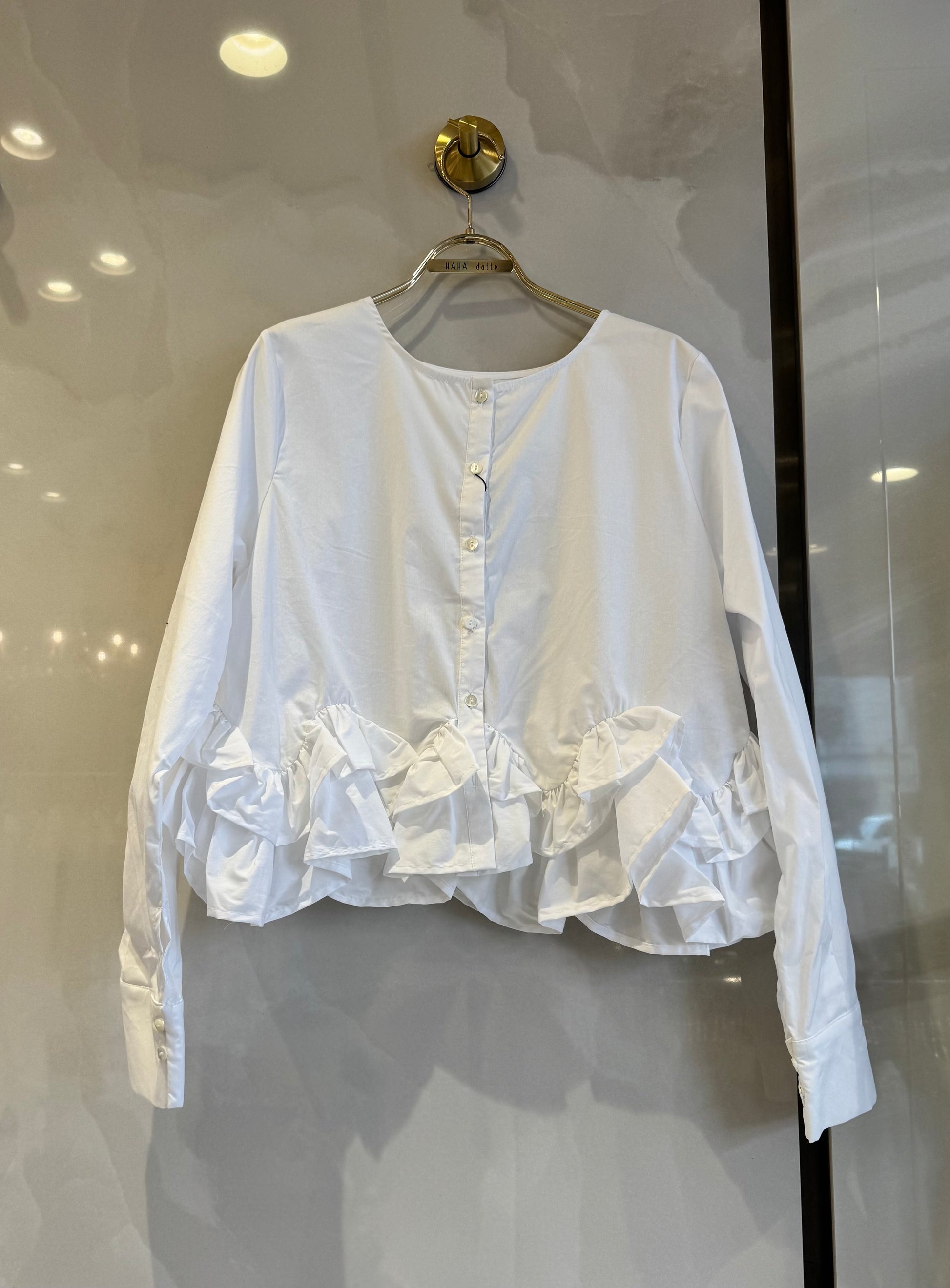 ノーカラーブラウスは、裾フリンジデザインと短丈が特徴です。
