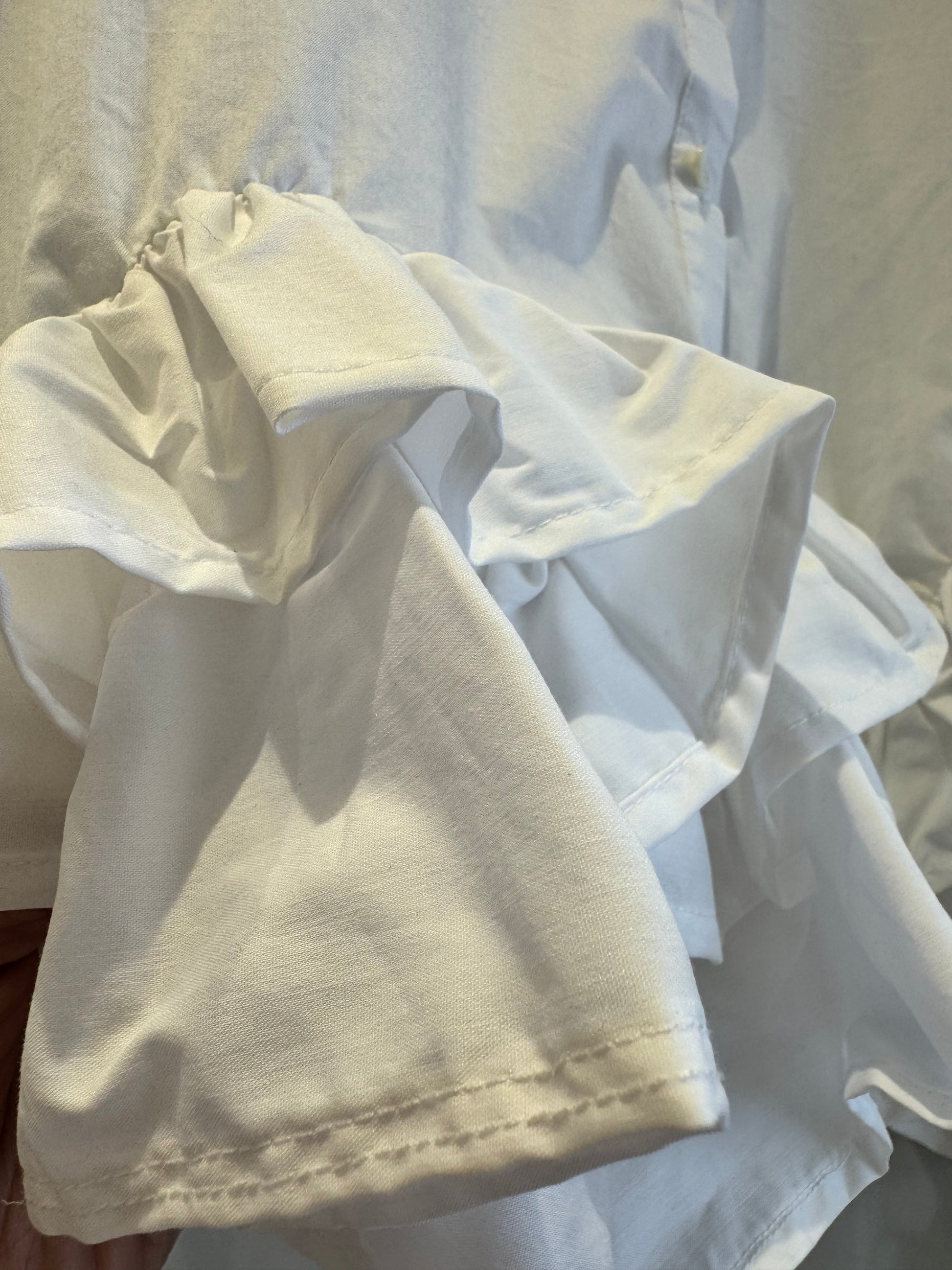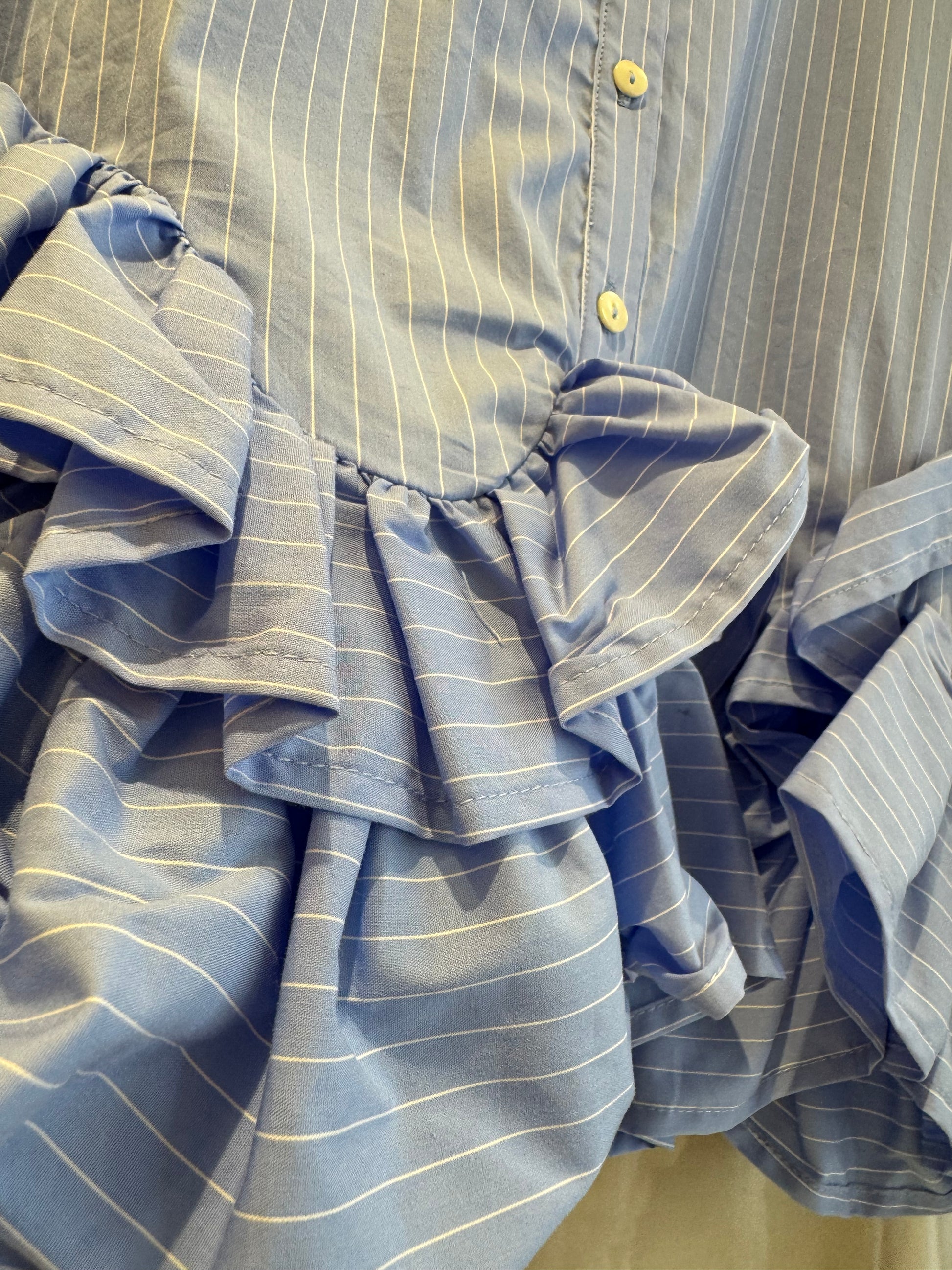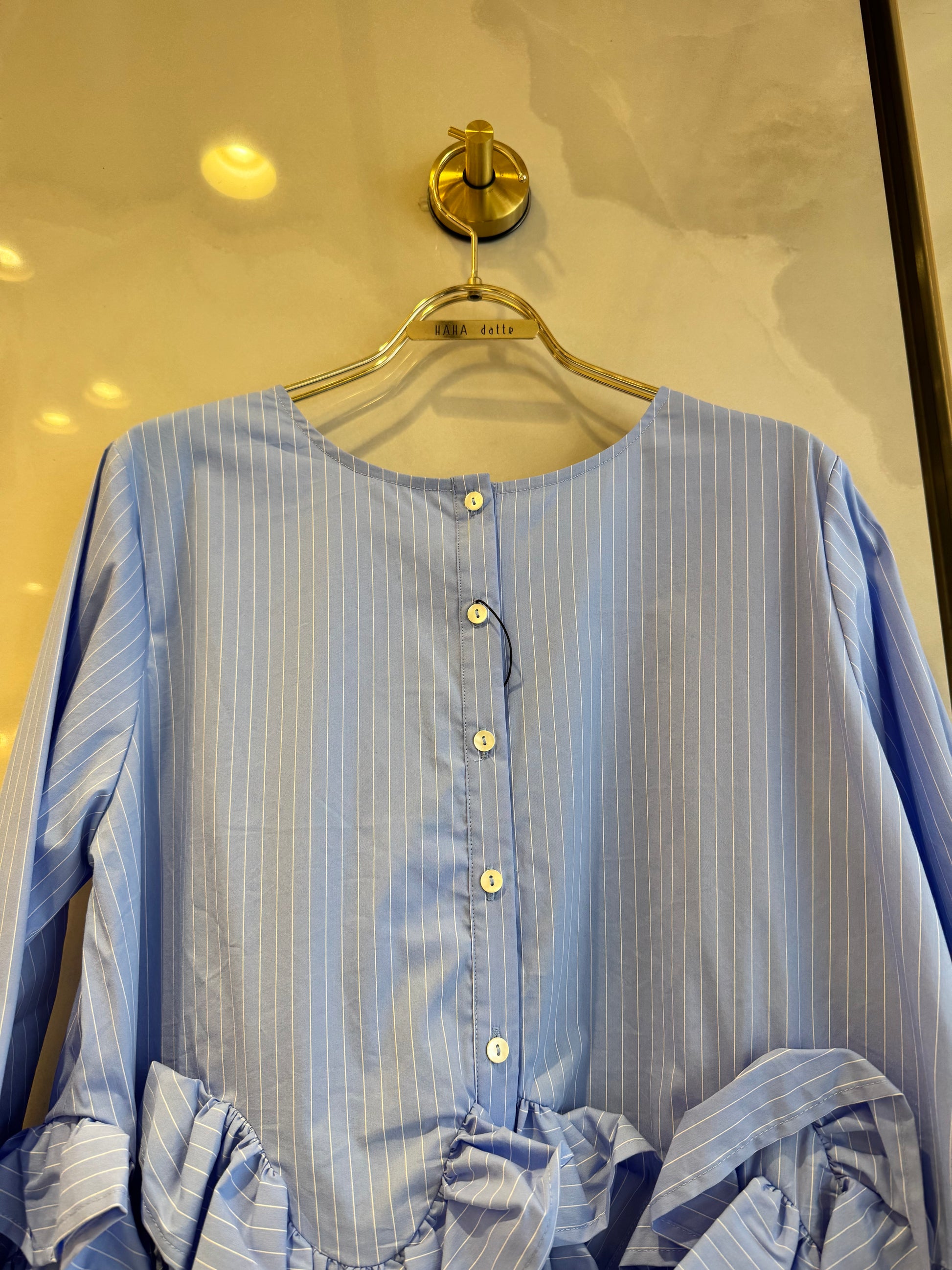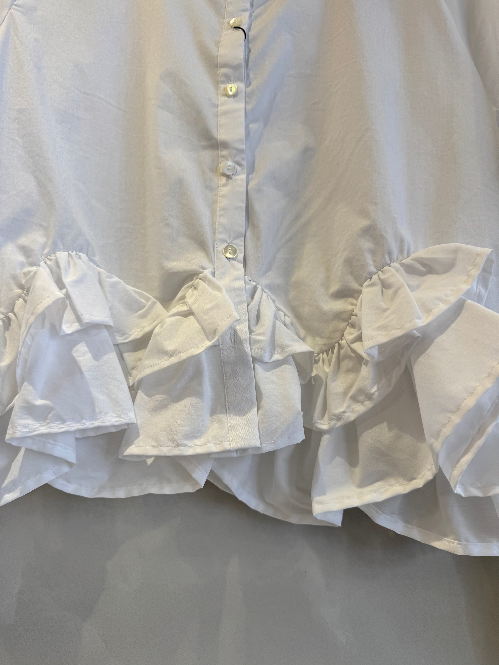 ノーカラーブラウスは、裾フリンジデザインと短丈が特徴です。