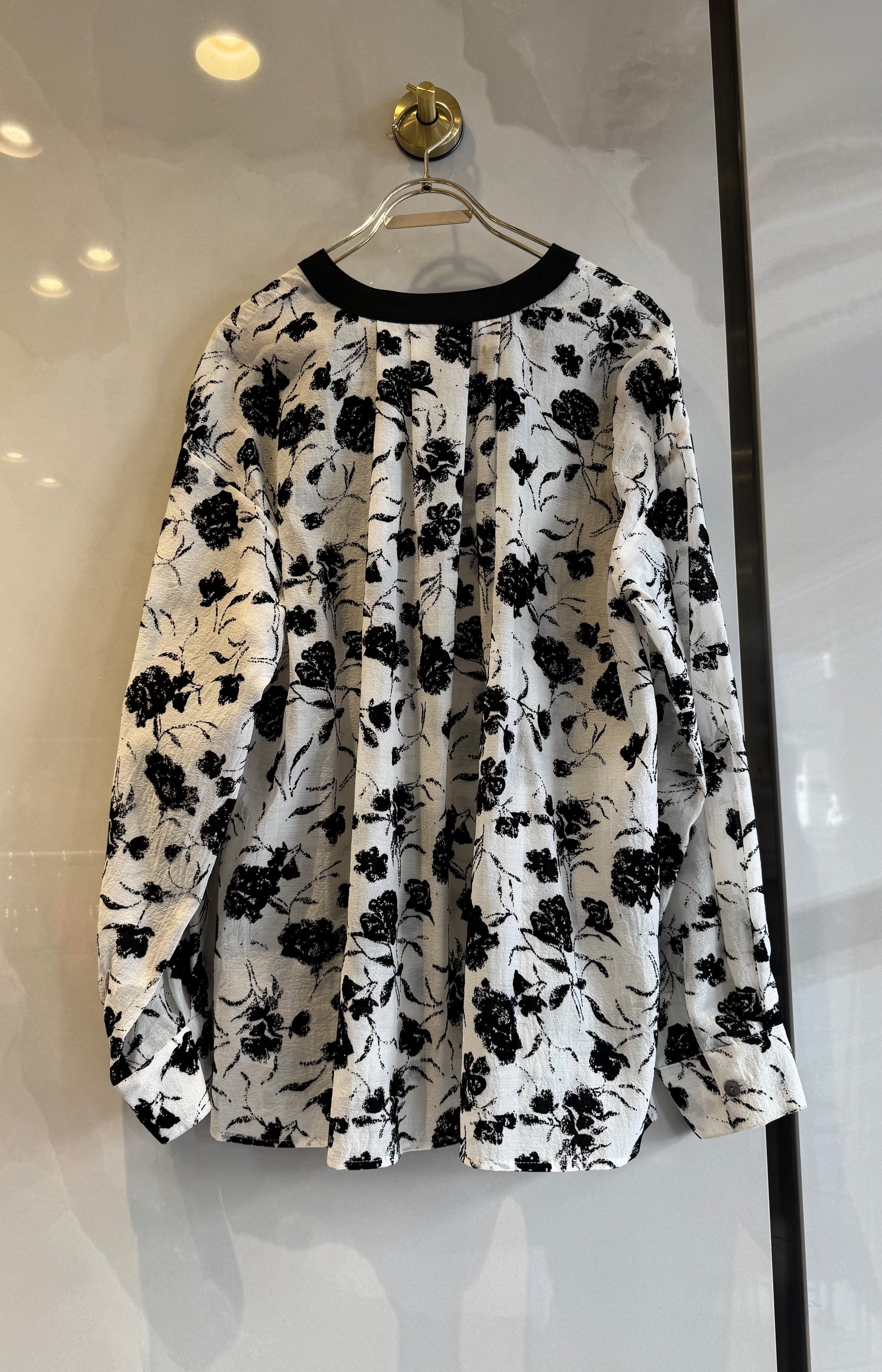 ノーカラーブラウスは、洗練された白黒の花柄デザインを特徴としており、様々なスタイルに合わせやすいアイテムです。
