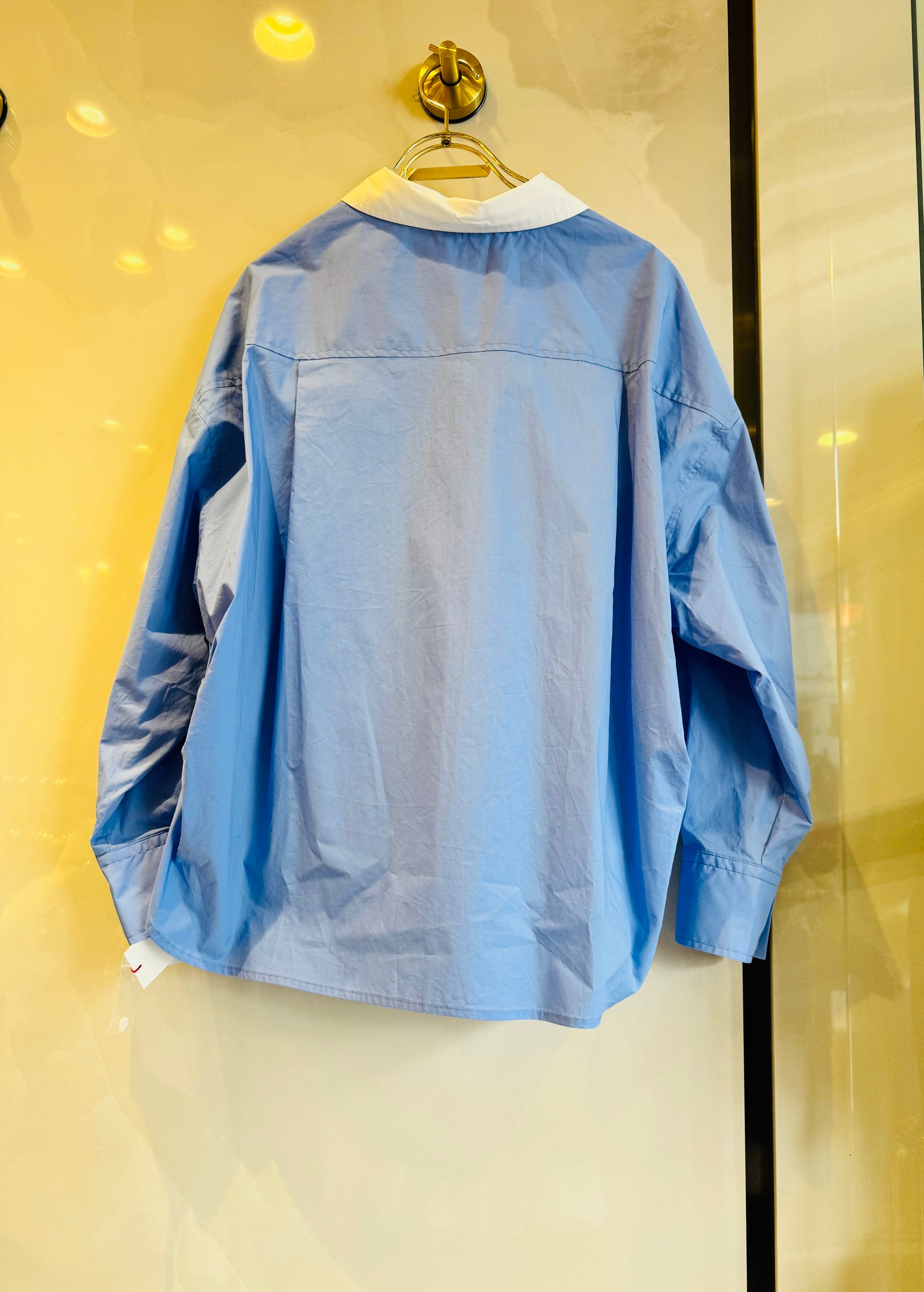 このクリケットシャツは、白い襟元とワイドシルエットを特徴としており、カジュアルなスタイルに最適です。